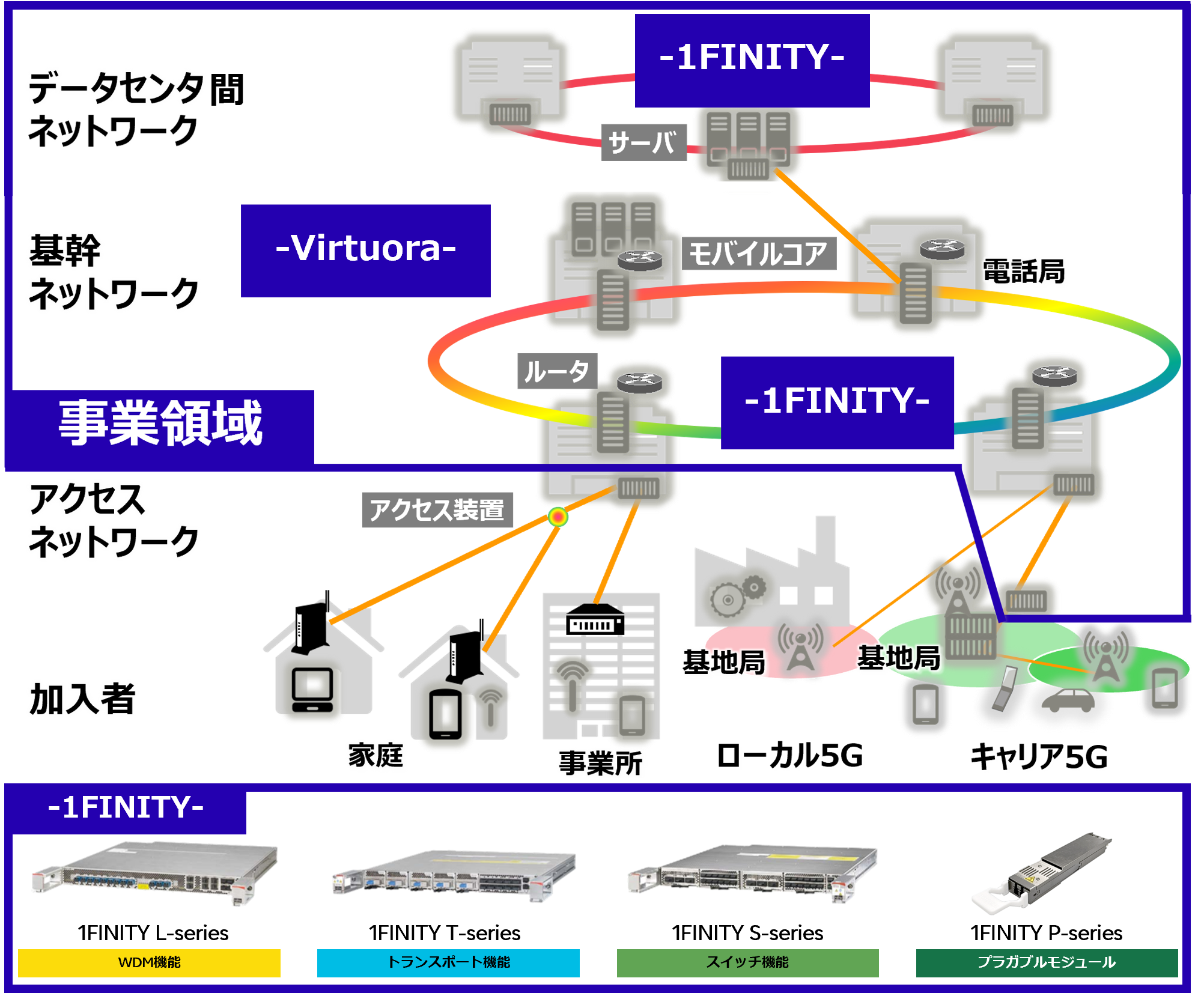フォトニクスシステム事業本部では、光ネットワークのうち、「基幹ネットワーク」を中心に事業を展開しています。データセンタの増加を受け、事業領域を「データセンタ間ネットワーク」にも拡大しています。大容量・低遅延を実現する光伝送装置 “1FINITY” と、ネットワーク制御システム “Virtuora” の開発・販売・保守が私たちの主要な業務です。